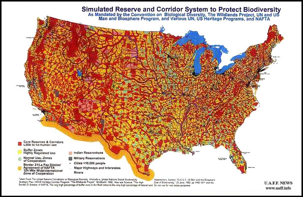 Στην φωτογραφία, με κόκκινο και κίτρινο είναι οι περιοχές χωρίς ανθρώπους και στα ελάχιστα μαύρα στίγματα θα βρίσκονται οι τερατουπόλεις όπου οι ένοχοι άνθρωποι που κόντεψαν να καταστρέψουν την καημένη τη φύση θα ζουν στα κρατικά σπίτια τους, που ουσιαστικά θα ανήκουν στις τράπεζες, δύο δύο ή και τρεις τρεις οικογένειες μαζί, αφού η ιδιοκτησία θα απαγορεύεται και λόγω υψηλής φορολογίας θα είναι αδύνατη. Ο όρος