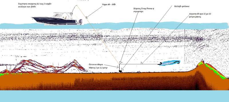 Πετονιά, οπωσδήποτε αόρατη αν ψαρεύεις μέχρι 60 μέτρα γιατί κάτω από αυτά ίσως να είναι περιττή. Βέβαια η αόρατη έχει και μεγαλύτερη αντοχή από την απλή. Διαμέτρου μ.ο. 0,60 mm