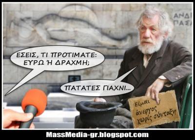 Δημήτρη μου, αυτόν τον απελπισμένο άνθρωπο, αν τον ρωτούσε ο Δημοσιογράφος τι προτιμάς; ΝΔ, ΠΑΣΟΚ, ΚΚΕ, ΛΑ.Ο.Σ, ΣΥΡΙΖΑ, ΑΝΑΡΧΙΚΟΥΣ, ΚΟΥΚΟΥΛΟΦΟΡΟΥΣ, ΑΓΑΝΑΚΤΙΣΜΕΝΟΥΣ, κ.λ.π. ..., πάλι το ίδιο θα απαντούσε, δηλαδή "ΠΑΤΑΤΕΣ ΓΙΑΧΝΙ".