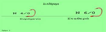 Συνοψίζοντας έχουμε νήμα 50lb στο τελείωμα του δένουμε το αόρατο παράμαλλο 0,60 είτε με τον κόμπο παραπάνω είτε με στριφτάρι (πάνω από 30 κιλά δύναμη), στην περίπτωση του κόμπου φτιάχνουμε με το νήμα που περισσεύει μια θηλιά και εκεί κρεμάμε το στριφτάρι ταχείας απελευθέρωσής στο οποίο έχουμε δέσει πετονιά 40αρα από 1 έως 1,5 μέτρο και στο τέλος το μολύβι. Η αόρατη πετονιά/ παράμαλλο που αφήνουμε είναι από 12 έως 18 μέτρα ανάλογα το βάθος και την δομή του βυθού( μπορεί να είναι και 5 μέτρα αν είμαστε βαθιά και σε μέρος με απότομα κατεβάσματα) και στο τελείωμα της διπλαρώνουμε και περνάμε τα δύο αγκίστρια όπως στην φωτογραφία. Το πρώτο είναι συρόμενο για να το προσαρμόζουμε ανάλογα με το μέγεθος του δολώματος και το τελευταίο σταθερό. Δες την photo γιατί σπίτι δεν έχω πετονιές για να ανεβάσω βίντεο.